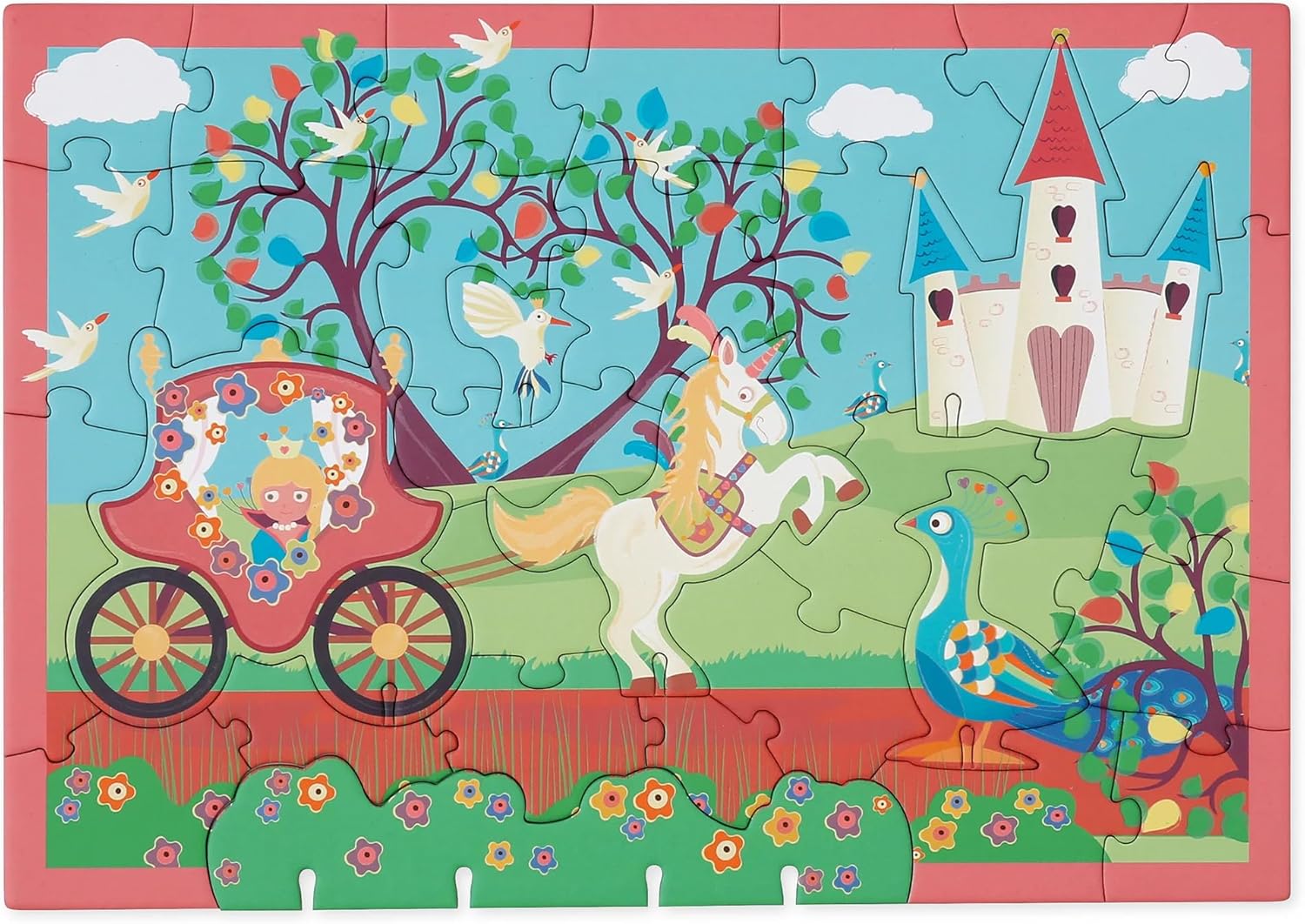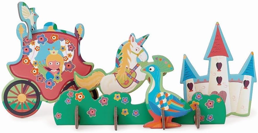 Create an enchanting image of a princess in her carriage on her way to the fairytale castle by fitting the pieces together. Bring the puzzle to life by popping out the 3D figures and propping them with the stands for a 3D effect.