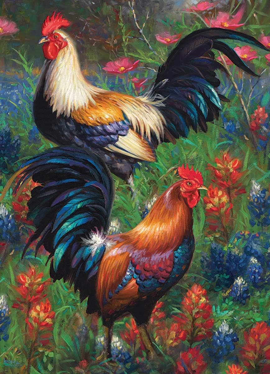 Rich jewel tones bring two striking roosters to life as they stand proudly among blooming flowers in this stunning 1000-piece puzzle. Created as a heartfelt Christmas gift, the artwork celebrates family and tradition-featuring a beloved rooster inspired by the artist's own farm and a family name that means "rooster." With its vibrant colors and elegant composition, this puzzle is designed to brighten any space and bring a smile with every piece placed.