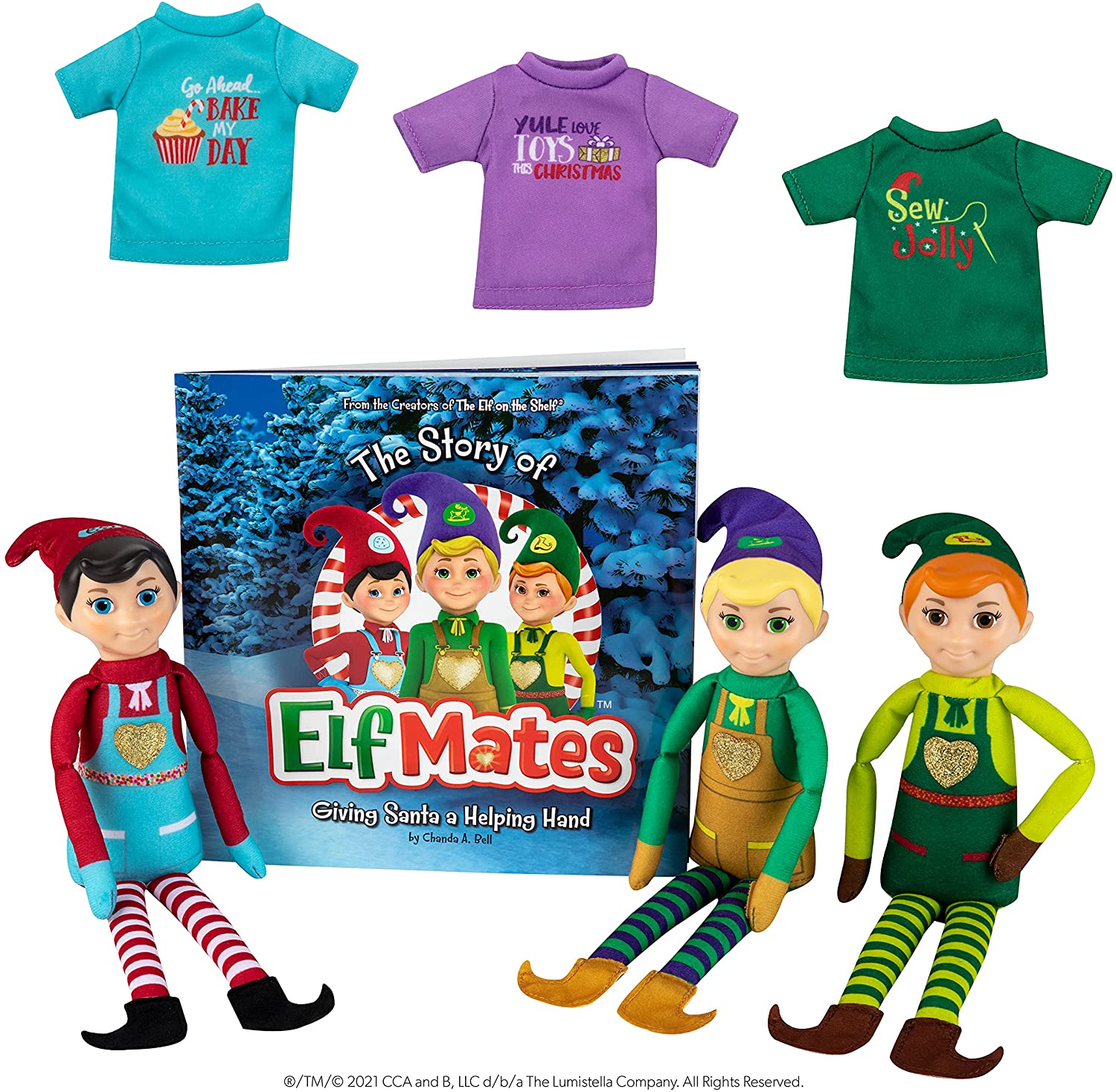 This bundle includes three Elf Mates (Chef, Toy Maker, and Cobbler) each with their own elf-sized T-shirt, plus a charming 16-page storybook that shares how these helpers encourage acts of goodwill.
