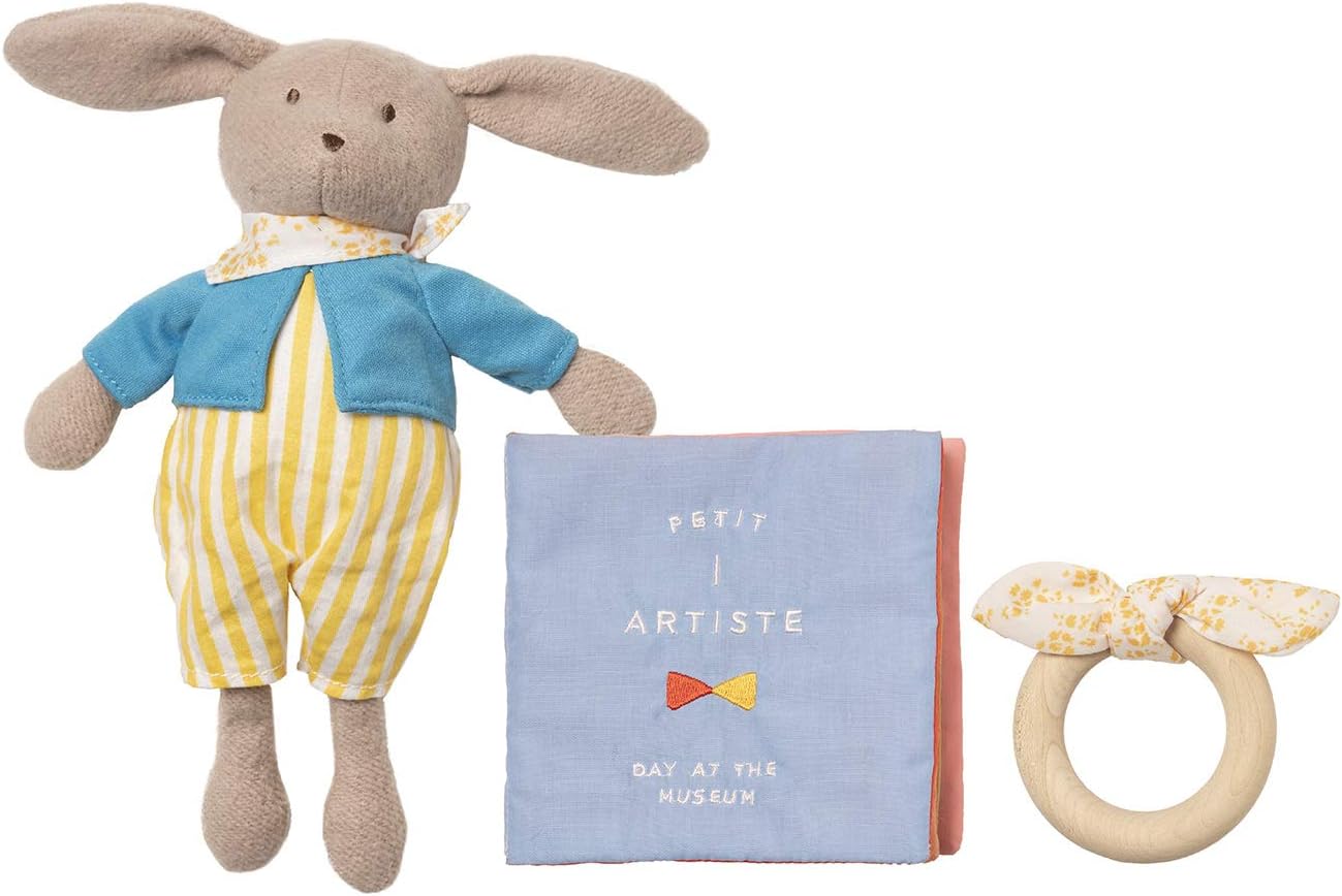 The Petit Artiste Gift Set for infants and toddlers features an attractive soft fabric stuffed bunny doll made of cotton blended fabrics and soft covered multi-colored crinkle book, useful for visual, tactile, and auditory sensations. Gift set also includes a natural, unfinished teether, adorned with a swatch of coordinated fabric.